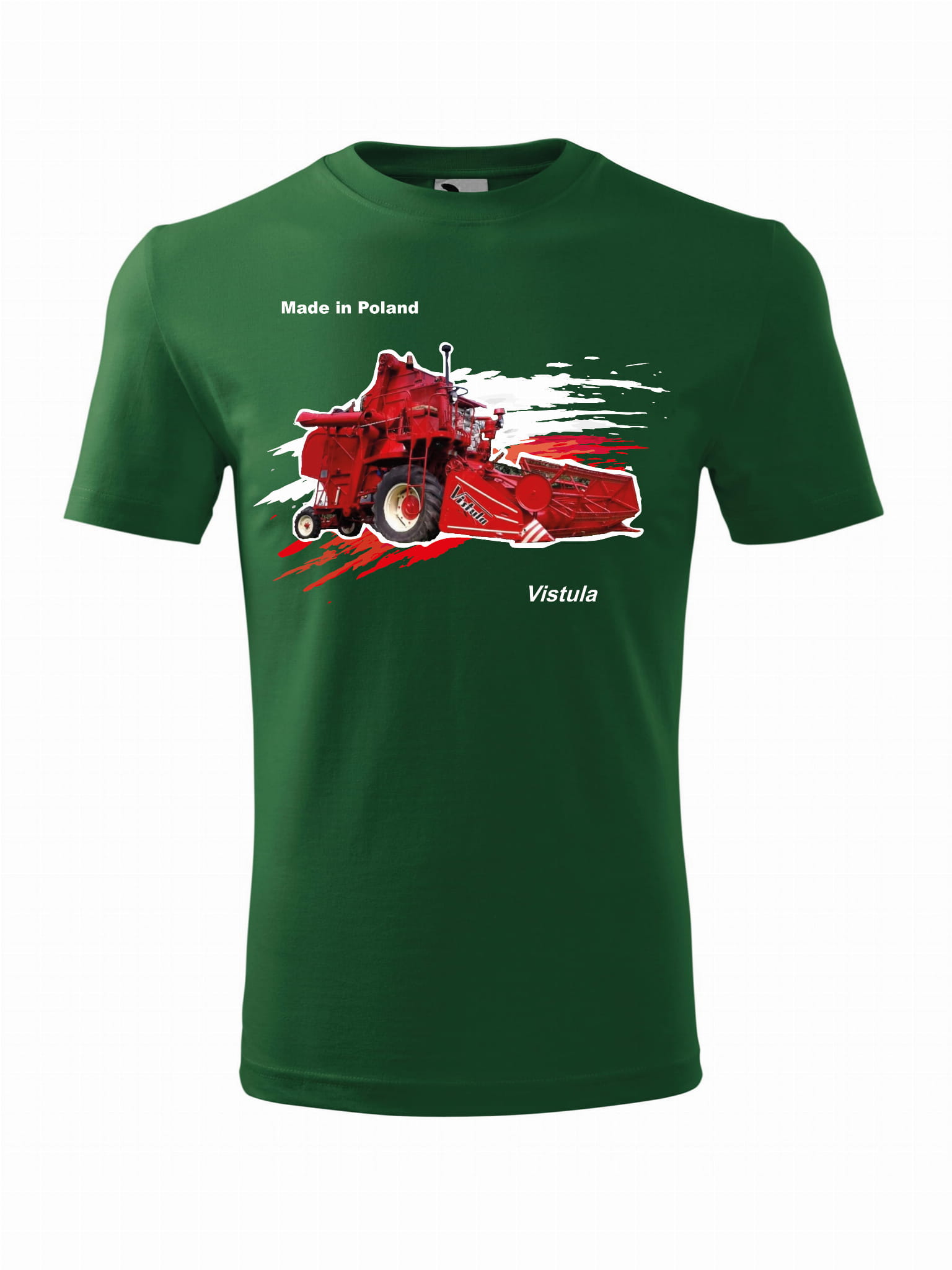 Koszulka „KOMBAJN” wykonana jest z wysokogatunkowej bawełny o gramaturze 200 g/m², z opcją ciemnoszarego melanżu zawierającego dodatek wiskozy dla większego komfortu i trwałości. Motyw na koszulce nawiązuje do kultowego kombajnu Vistula produkowanego w Polsce od lat 50., który zrewolucjonizował żniwa i usprawnił pracę na polach. Model unisex posiada konstrukcję bez szwów bocznych, silikonowe wykończenie oraz taśmę wzmacniającą na ramionach, co zapewnia wygodę i długotrwałość użytkowania. Dostępny w rozmiarach XS–3XL. Zalecane pranie w temperaturze 40 °C (melanż – 30 °C) utrzymuje jakość nadruku i materiału.